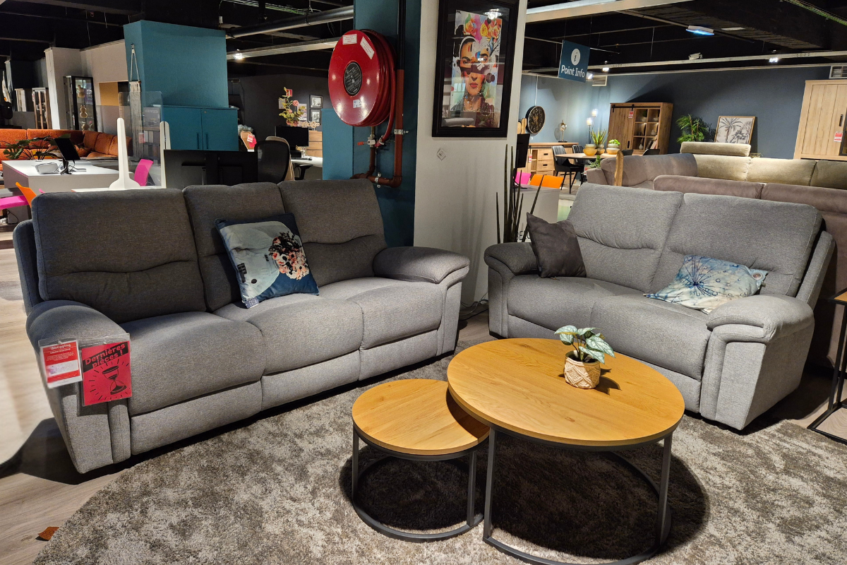 Modèle d'exposition ou stock restant. Classique et confortable, le salon GUSTAVE en tissu chiné gris est composé d'un canapé 3 places 2 relax électriques et d'un canapé 2 places fixes. Il vous procurera de très bons moments de détente : relaxez-vous et profitez. Venez le découvrir dans notre showroom Meubles Belot à Soignies.