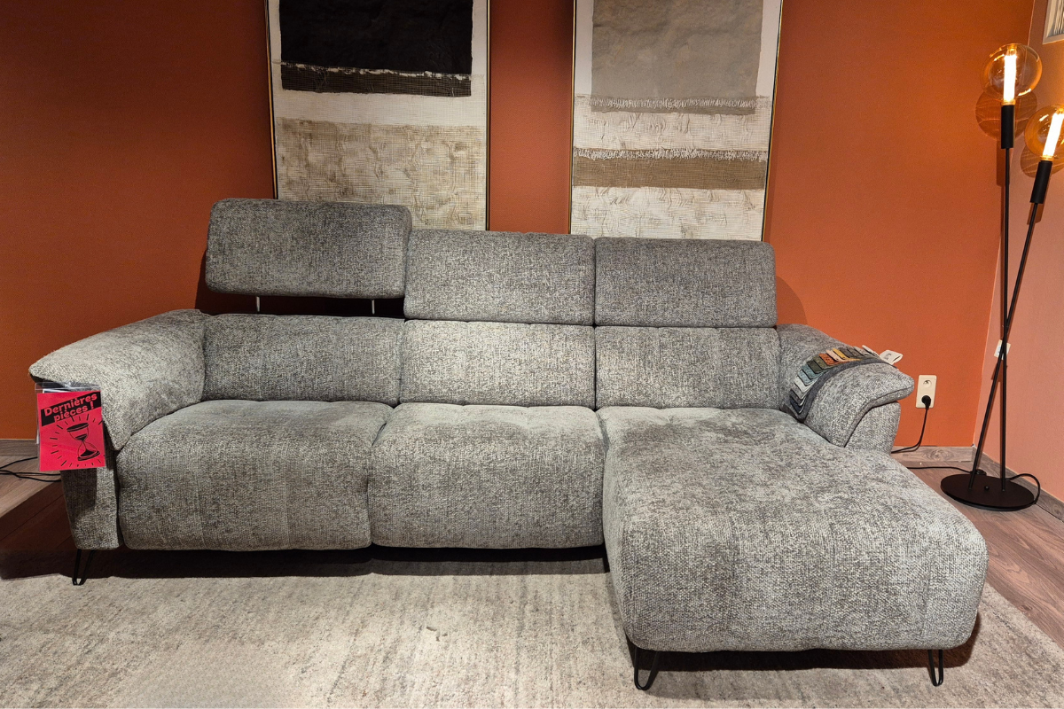 Modèle d'exposition. Canapé 2,5places + chaise longue droite ICONE en tissu Baobab gris. Mousse confort standard. Venez le découvrir dans notre showroom Meubles Belot.