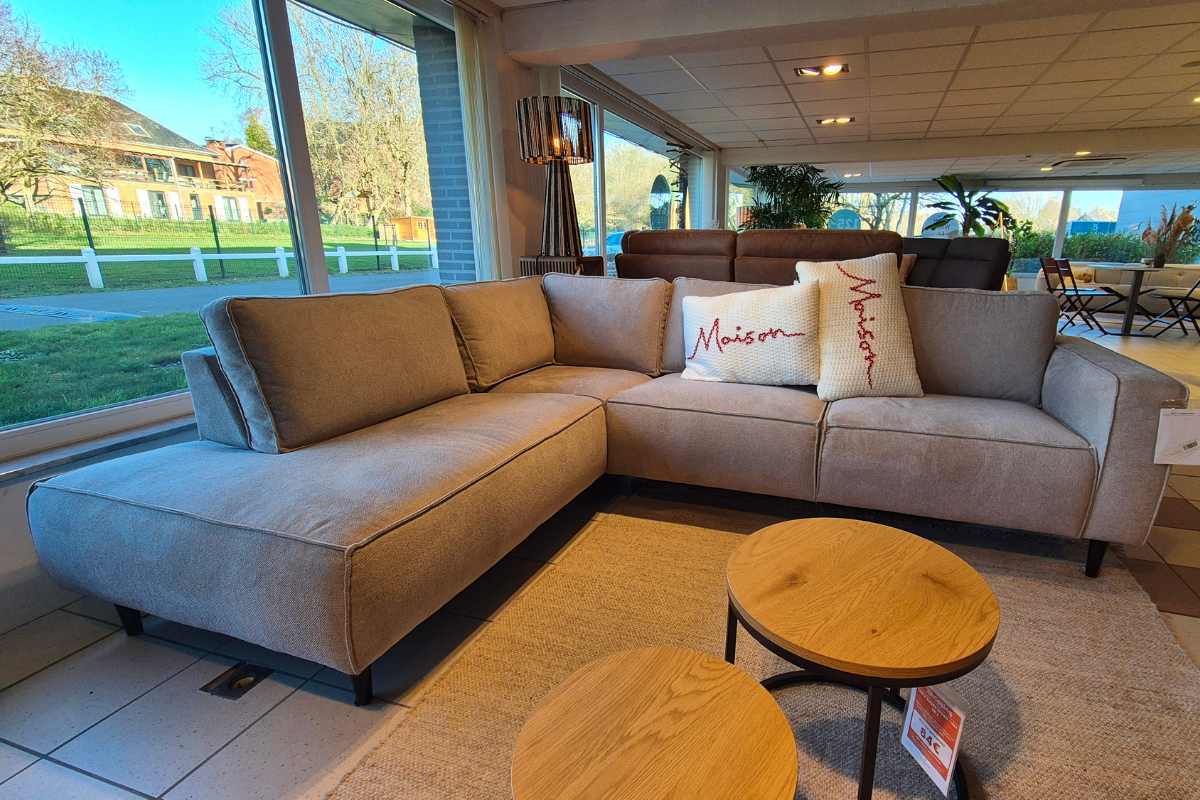 Modèle d'exposition. Ce canapé d'angle JESI est un canapé contemporain en tissu beige reposant sur des pieds fins en métal noir. Avec son ottomane placée à gauche, il offre une assise spacieuse et confortable, s’adaptant parfaitement à un intérieur lumineux.