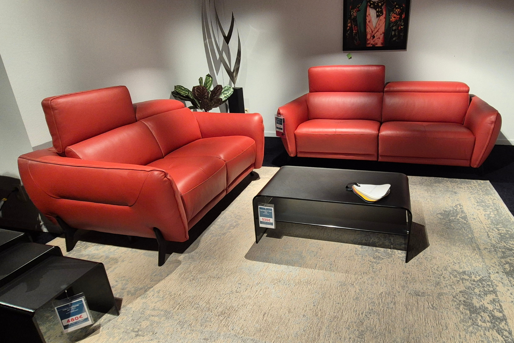 Modèle d'exposition. Ensemble composé d'un canapé 3 places avec 2 relax et d'un canapé 2 places fixe, dans un superbe cuir couleur Terracotta. Confort de mousse Standard et de jolis pieds design noirs pour relever l'ensemble avec élégance. Ne tardez plus à venir essayer ce modèle haute qualité dans notre showroom.
