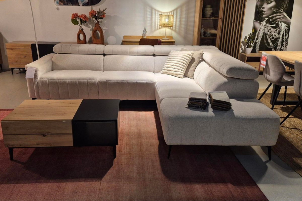 Modèle d'exposition ou stock restant. Le salon Onyx séduit par son style moderne et son confort incomparable. Cette version est composée d’une place et demie gauche avec relax électrique, d’une place et demie fixe et d’une ottomane droite. Habillé d’un tissu Forte 22 blanc cassé (cat. 2), il allie élégance et bien-être au quotidien. Un canapé pensé pour vos instants de détente, à découvrir chez Meubles Belot.