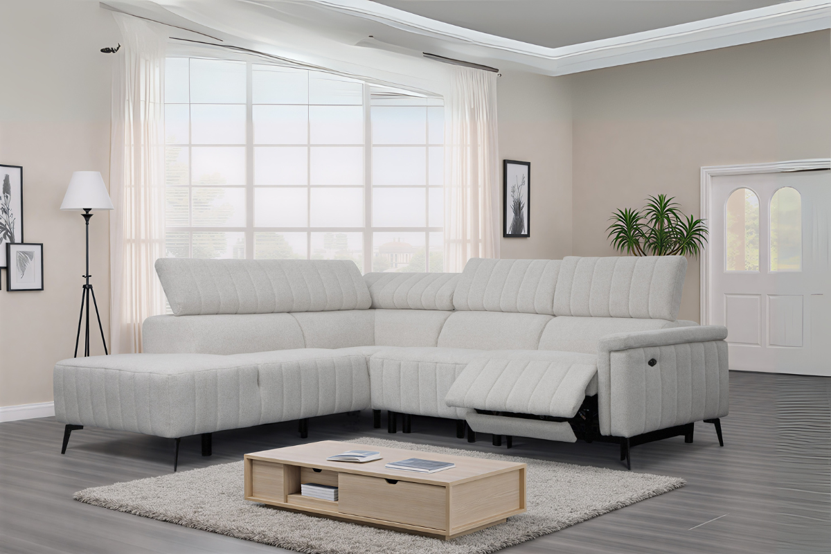 Modèle d'exposition ou stock restant. Le salon Onyx associe design contemporain et confort optimal. Cette configuration comprend une ottomane gauche, une place et demie fixe, et une place et demie équipée d’un relax électrique droit. Revêtu d’un tissu Forte 22 blanc cassé (cat. 2), il séduit par ses lignes modernes et son assise accueillante. Un canapé idéal pour profiter de moments de détente, à découvrir chez Meubles Belot.