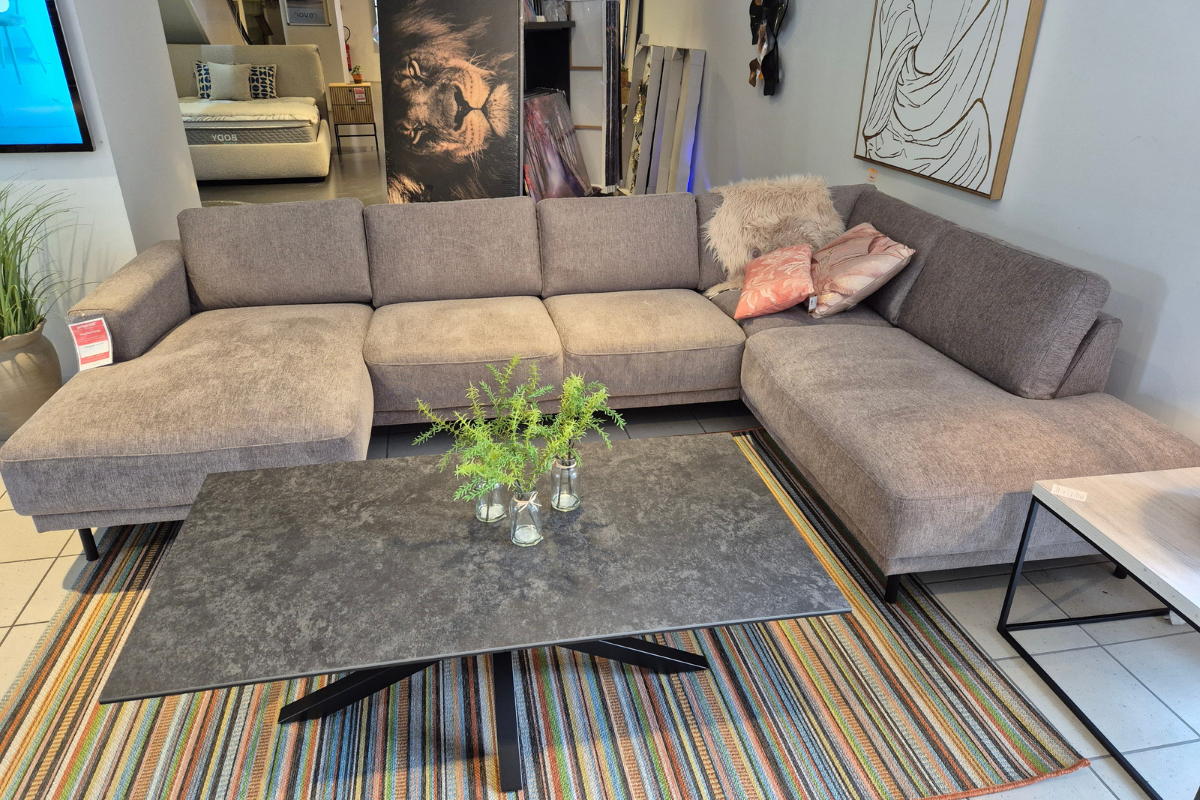 Modèle d'exposition ou stock restant. Le salon PORTLAND, en tissu gris, se distingue par son design moderne. Il comprend une méridienne à gauche et une ottomane à droite, reposant sur des pieds en métal noir. Ce canapé allie confort et élégance, parfait pour un intérieur contemporain.