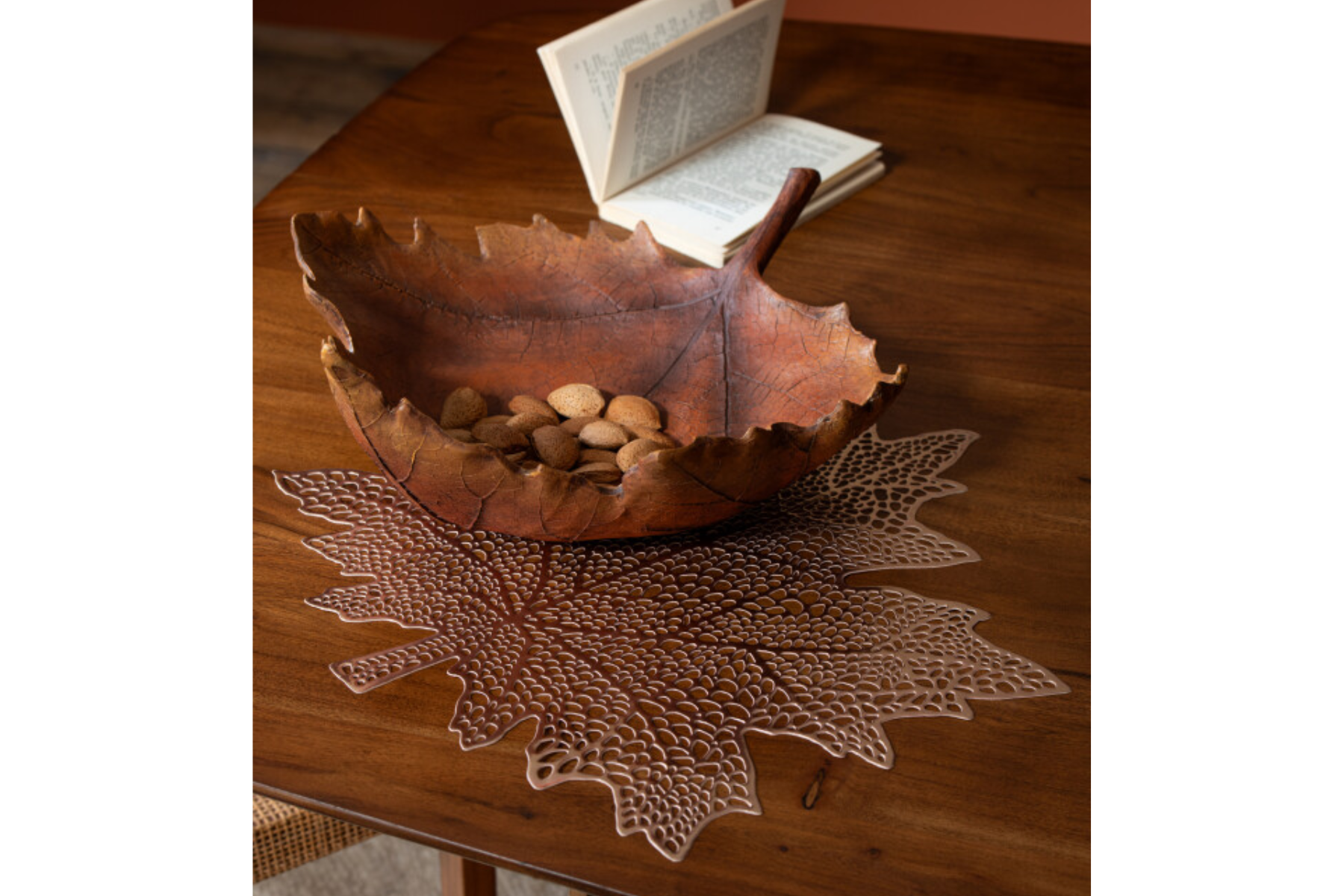 Ce set de table en forme de feuille, au design ajouré et à la teinte marron chaleureuse, apporte une touche naturelle et élégante à votre table. Idéal pour sublimer vos repas d’automne, il se marie parfaitement avec des décorations en bois et des tons terreux, à découvrir chez Meubles Belot.