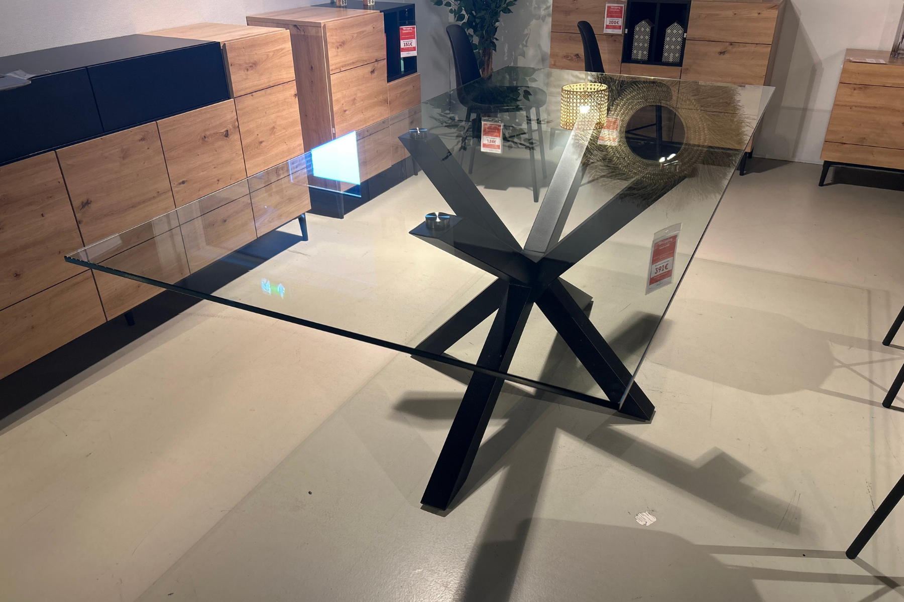 Modèle d'exposition. Magnifique table de la collection Arya. Table avec pieds en acier et plateau en verre trempé. Design tendance et original. Venez le découvrir dans notre showroom Meubles Belot à Soignies.