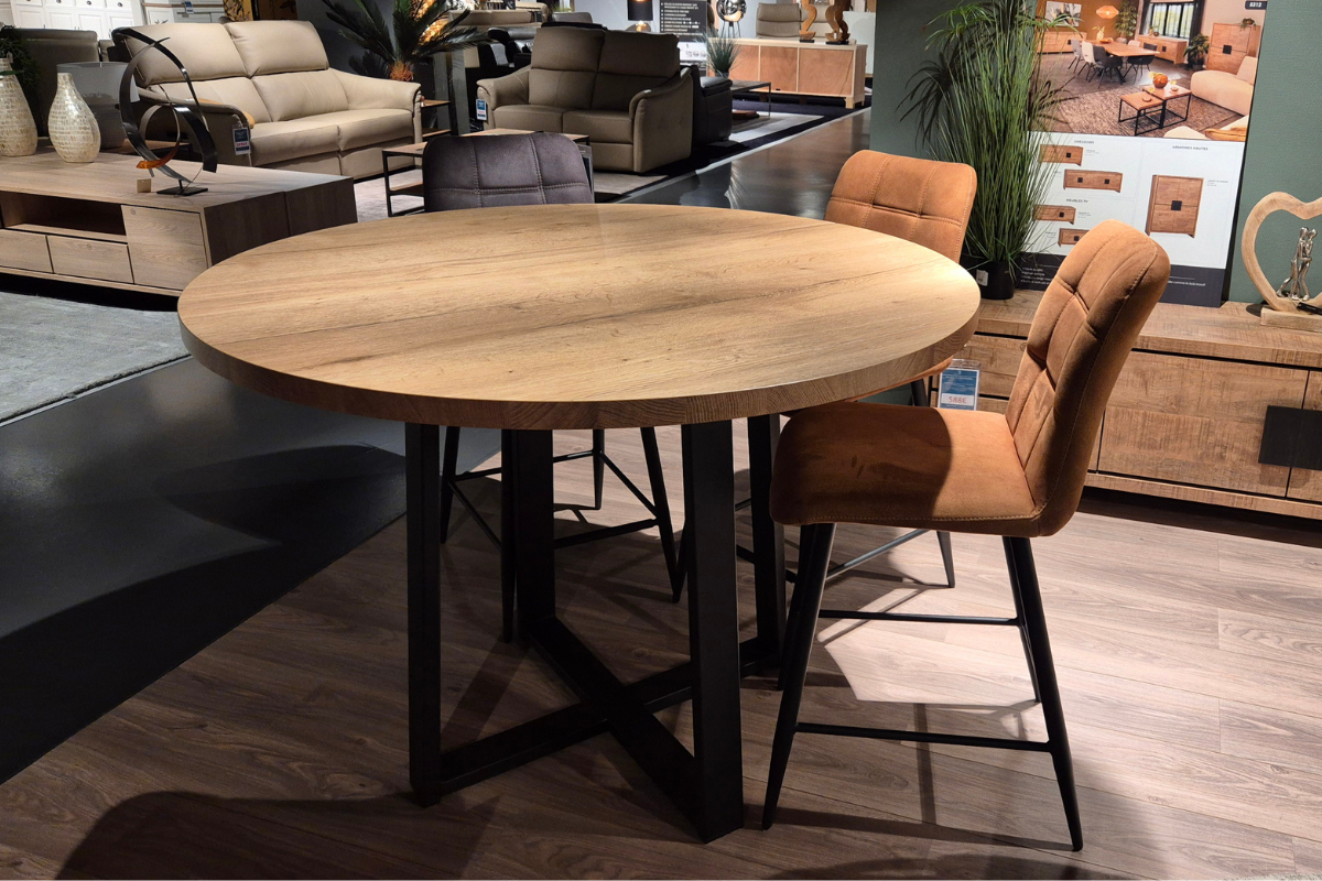 Modèle d'exposition. Table bar ronde 130 de la collection Domino de Maxfurn en lamulux bois naturel. Lamulux représente la solution parfaite pour le consommateur qui veut l’expérience d’un matériel massif sans les désavantages de l’entretien et le coût d’un meuble massif. Lamulux a la ressemblance et le même touché que le bois massif ! Pieds en métal noir. Venez le découvrir dans notre showroom Meubles Belot à Soignies.