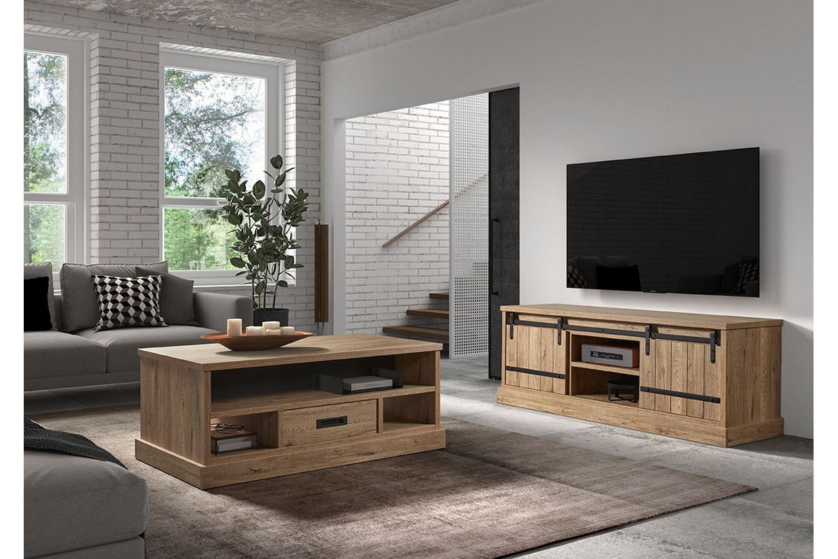 Table basse de la salle à manger Piero en finition Scarlet oak. Avec son style moderne et ses détails en métal noir, elle rendra votre intérieur convivial.