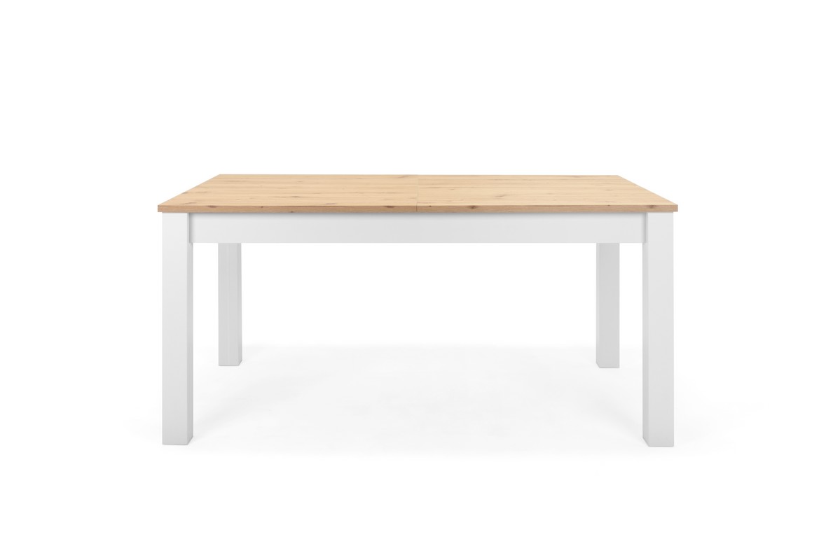 Table de 160 cm avec allonge l'agrandissant à 215 cm de la salle à manger au style vintage effectuée en blanc et chêne artisan. Venez le découvrir dans notre showroom Meubles Belot à Soignies.