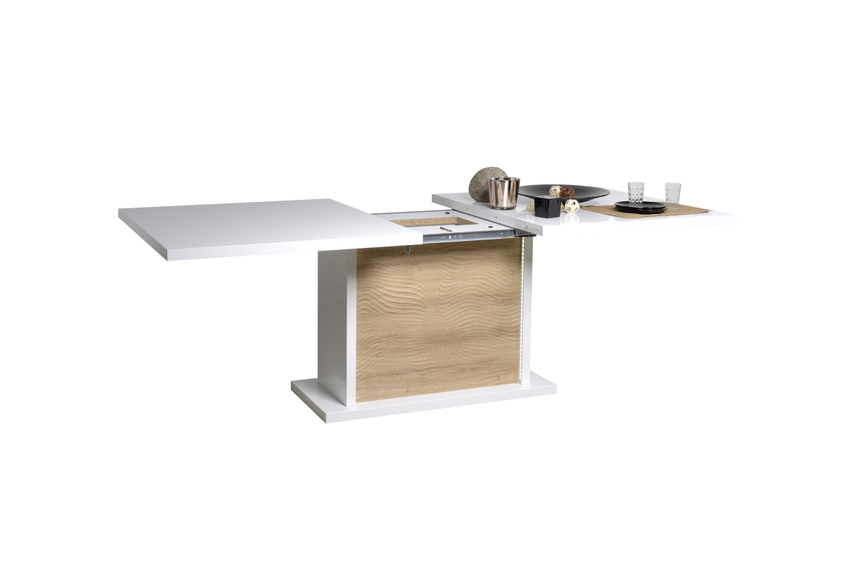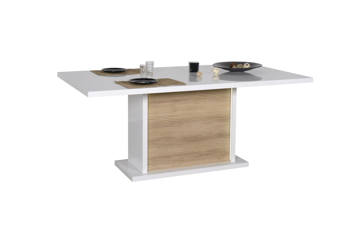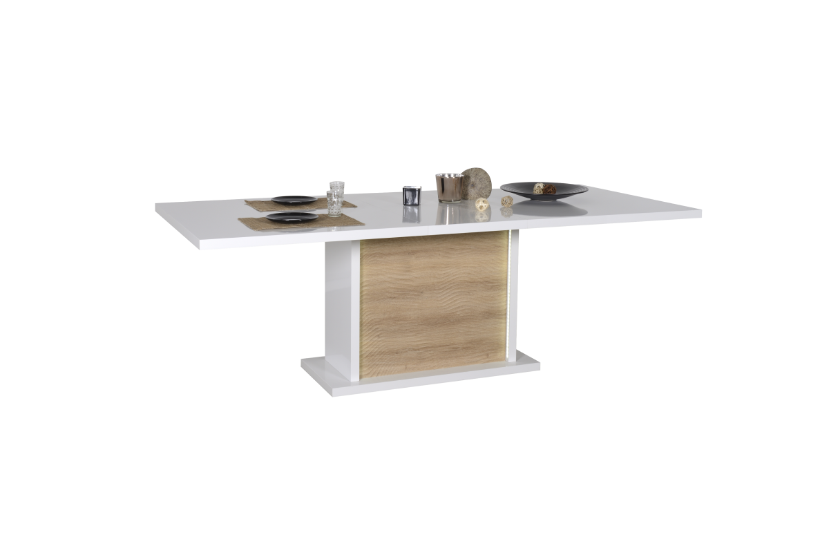 La table extensible de la salle à manger KARMA en laqué blanc et imitation bois, a un design tout à fait particulier, elle est dotée d'un éclairage sur son pied central qui lui apporte un côté high tech, aussi pratique qu'esthétique. Venez la découvrir dans notre showroom Meubles Belot à Soignies.