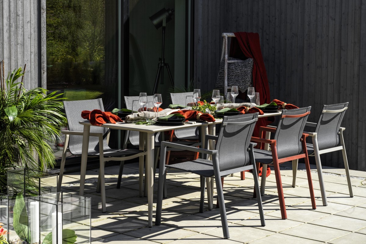 Cette table Nimes est de couleur beige kaki. Nimes est une collection de tables aux plateaux élégants et nervurés avec des pieds fuselés et arrondis. Grâce à une technologie unique, son dessus de table est insonorisant. Facile d'entretien, c'est une table de jardin très pratique et résistante à tous les temps.