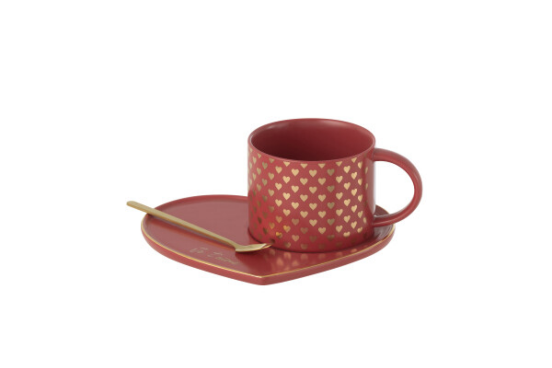 Craquez pour ce charmant set tasse, sous-tasse et cuillère en forme de cœur, en céramique rouge ornée de petits cœurs dorés. Parfait pour une pause gourmande pleine de tendresse, à découvrir chez Meubles Belot.