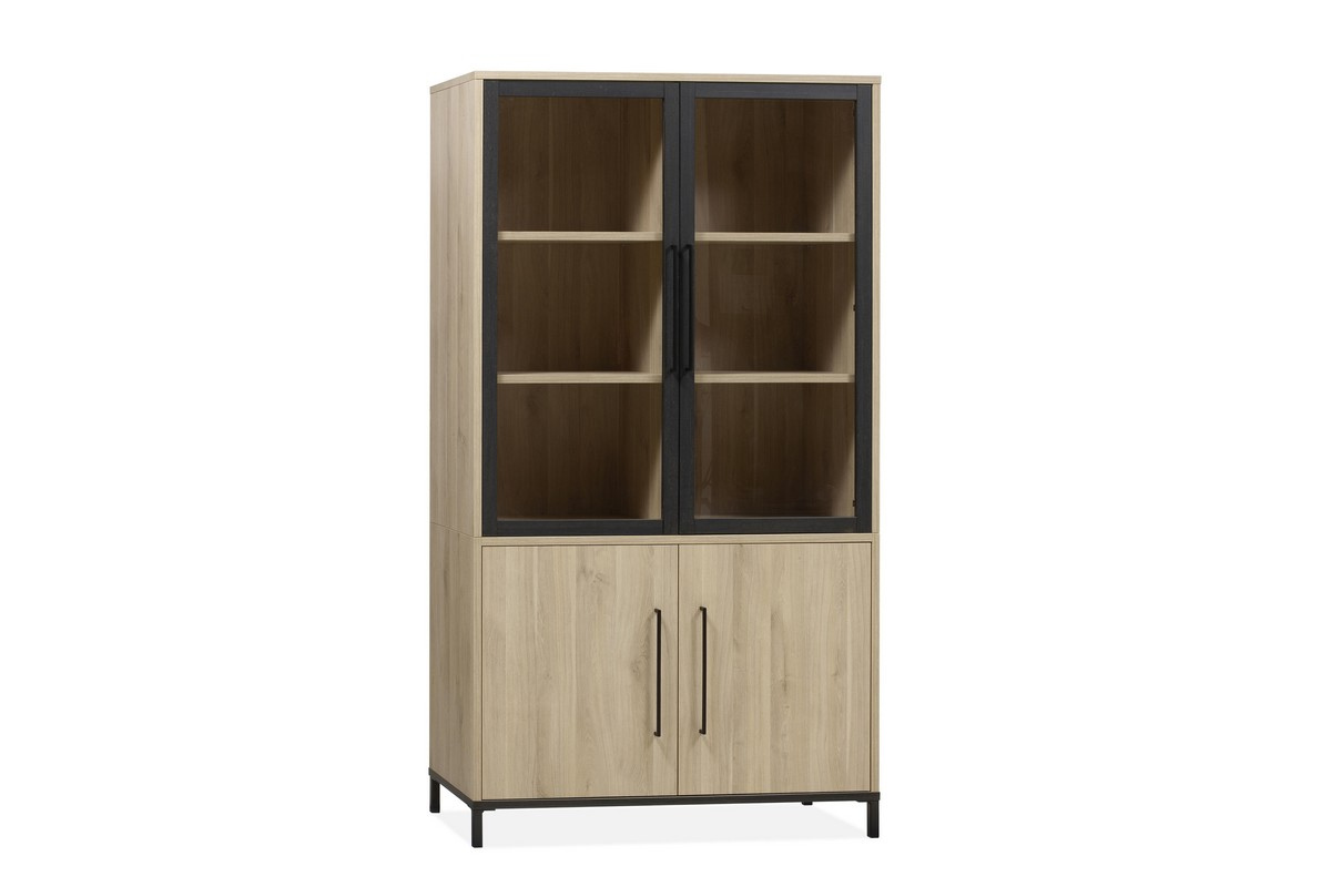 Armoire vitrine 2 portes vitrées et 2 portes pleines de la collection Bridge de Maxfurn en lamulux fresh oak et old piano. Lamulux représente la solution parfaite pour le consommateur qui veut l’expérience d’un matériel massif sans les désavantages de l’entretien et le coût d’un meuble massif. Lamulux a la ressemblance et le même touché que le bois massif ! Pieds en métal noir. Fermeture soft-close. Venez le découvrir dans notre showroom Meubles Belot à Soignies.