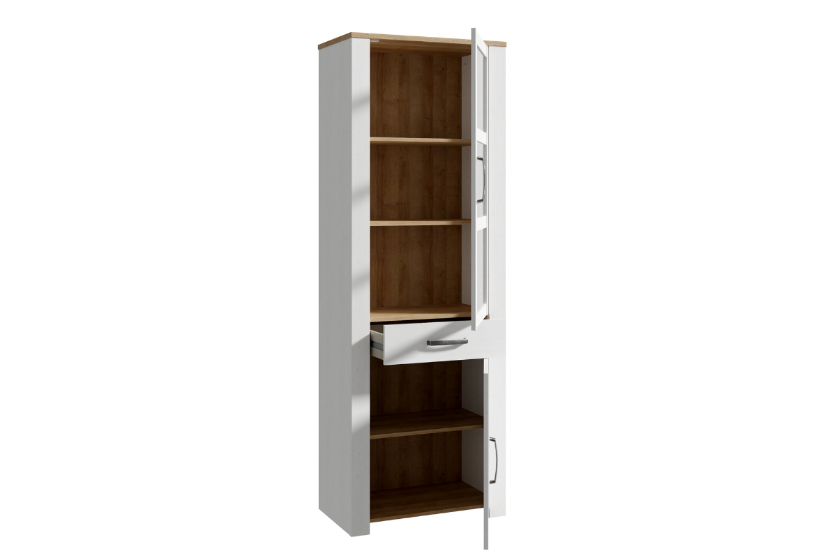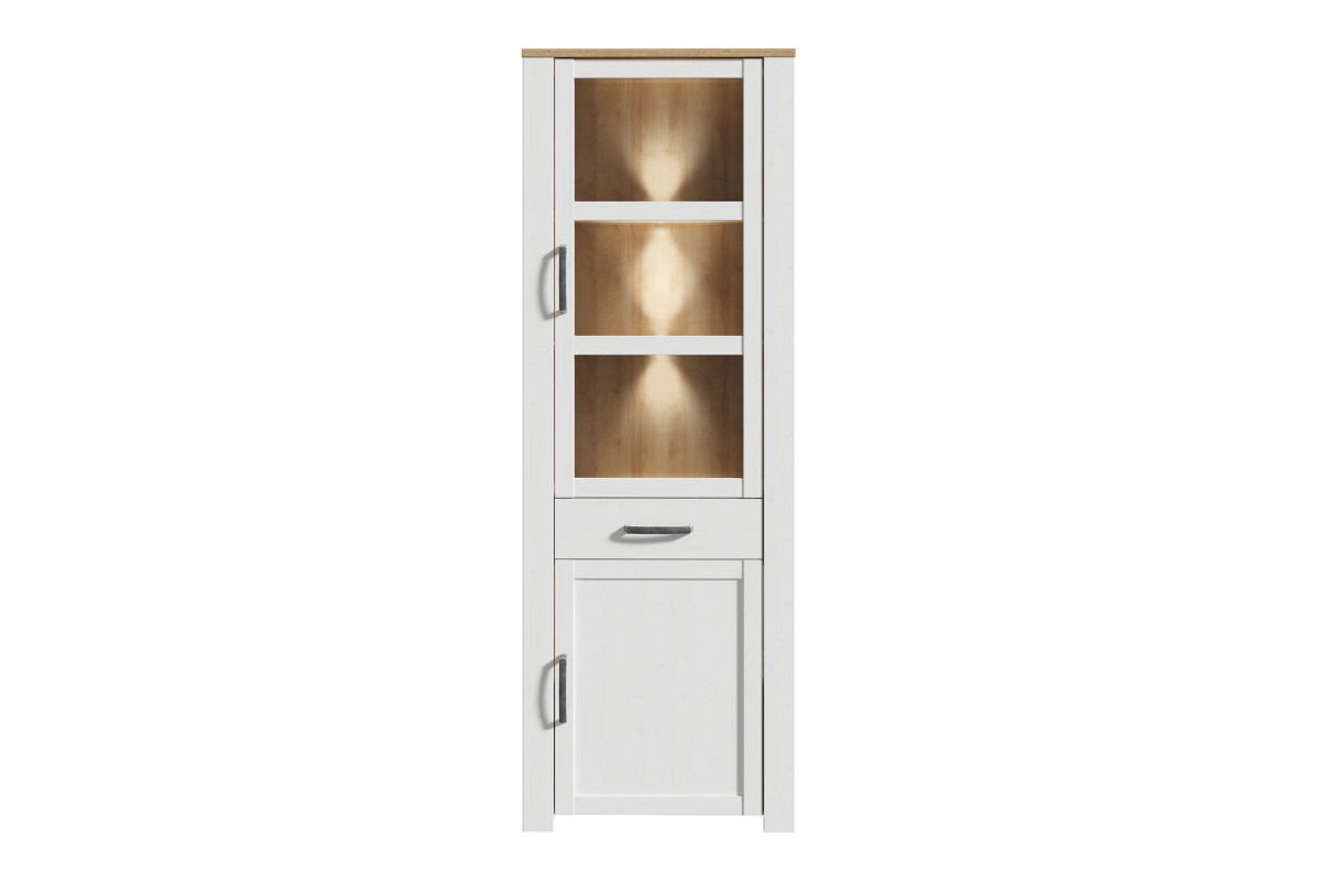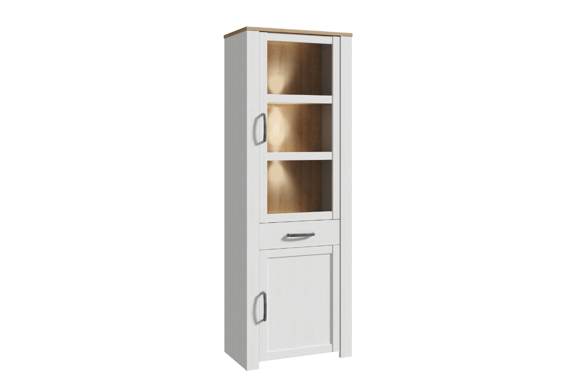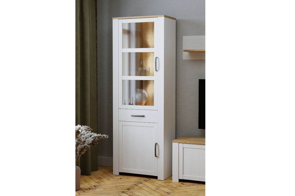 La vitrine Budapest (71,7 × 205,4 × 42 cm) séduit par son design lumineux et élégant. Sa finition chêne Riviera et mélèze Sibiu clair apporte douceur et modernité à votre intérieur. Avec sa partie vitrée éclairée, son tiroir et son espace fermé, elle offre un rangement pratique tout en mettant en valeur vos objets décoratifs. Un meuble fonctionnel et raffiné, idéal pour sublimer votre salon ou salle à manger. À découvrir chez Meubles Belot.