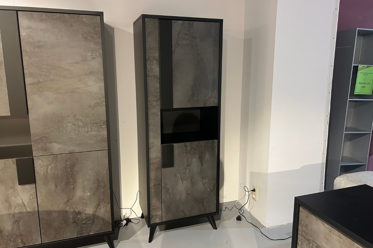 Modèle d'exposition. Vitrine LINE avec finition marbre gris et éclairage Led inclus. Découvrez-là en showroom à Soignies.