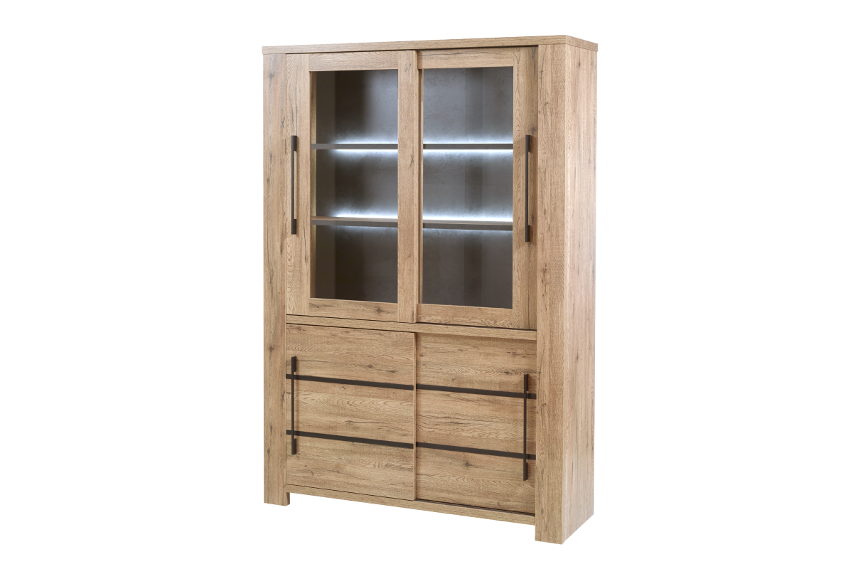 Vitrine en finition Scarlet oak avec portes coulissantes. La combinaison du bois et du noir donnera un style industriel à votre intérieur. Venez le découvrir dans notre showroom Meubles Belot à Soignies.