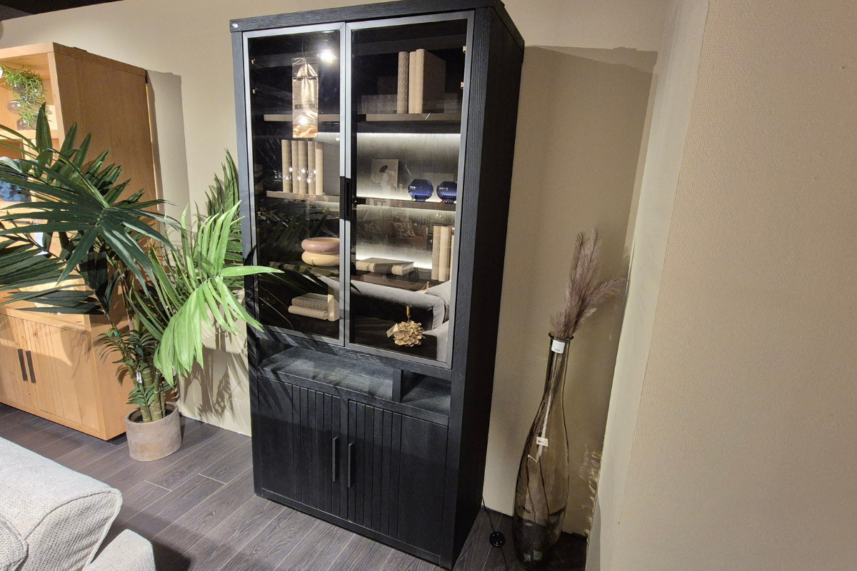 Modèle d'exposition. La vitrine 2 portes en verre 2 portes pleines 2 niches avec led de la collection PAVIE en placage chêne Castle Black est de style industriel et pleine de caractère, elle arbore une fine structure lattée en chêne massif qui lui donne une apparence uniforme, vous pouvez choisir si vous la voulez sur pieds en métal ou directement sur plinthe. Venez la découvrir dans notre showroom Meubles Belot à Soignies.