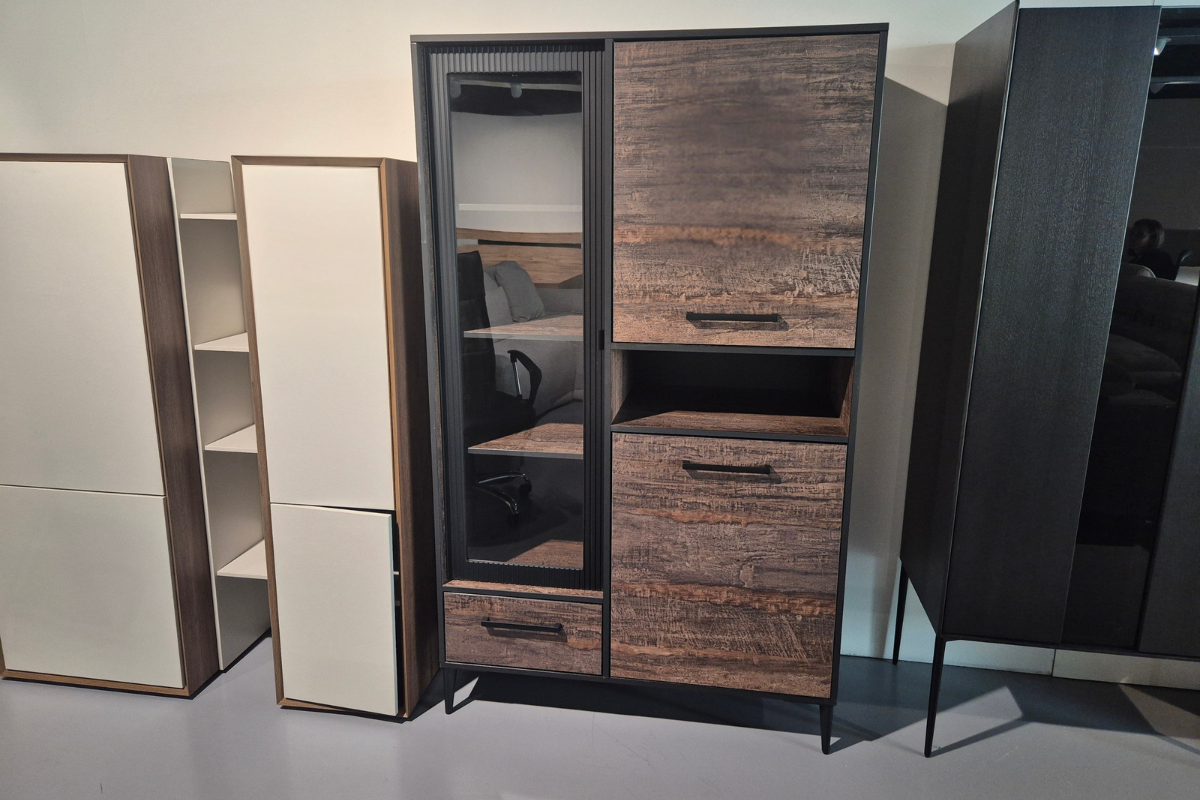 Modèle d'exposition. Armoire de rangement avec vitrine sur la gauche, 1 tiroir, 1 niche et 2 portes. Finition Dark Shipwood et poignées noir mat. Découvrez cette teinte chaude et authentique chez Meubles Belot à Soignies.
