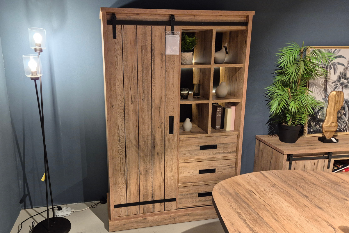 Modèle d'exposition ou stock restant. Argentier de la salle à manger Piero en finition Scarlet oak. Avec son style moderne et ses détails en métal noir, elle rendra votre intérieur convivial. Venez le découvrir dans notre showroom Meubles Belot à Soignies.